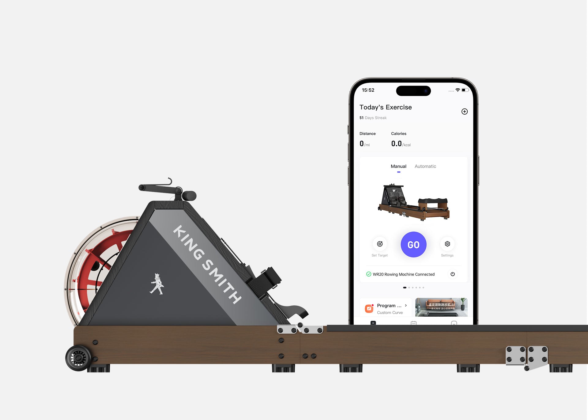 The KingSmith WR20 is a sleek, foldable water rower featuring a powerful 12-blade FluidForce resistance system with up to 176 lbs of resistance. Designed for all fitness levels, it offers smooth, low-impact full-body workouts and folds into a compact 3.1ft² footprint—perfect for modern homes.